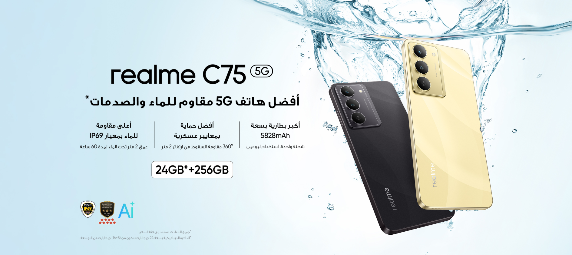 Realme C75 5G يجمع بين التصميم العصري، الأداء السريع، والبطارية الخارقة، مع مقاومة للماء والصدمات تخليه يتحمّل كل ظروف الاستخدام اليومي